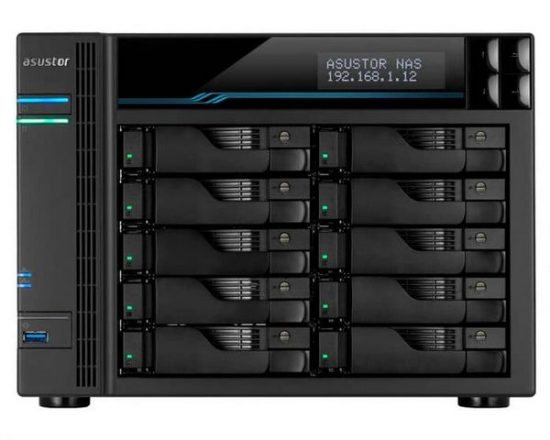 Ce modèle intègre 10 baies pour la partie stockage, avec une compatibilité avec la mise en cache SSD NVMe. En effet, il contient deux emplacements M.2 SATA, ainsi que la possibilité d'intégrer des disques de 3,5" ou 2,5" dans les slots. Le cache SSD apportera un gain intéressant au niveau des performances. La capacité maximale est de 160 To, extensible de 192 To supplémentaires grâce à l'extension de stockage ASUSTOR AS6004U, soit un total de 352 To.
