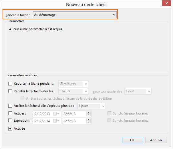 Ensuite, dans l'onglet "Déclencheurs" cliquez sur "Nouveau.." afin d'indiquer sous quelle condition s'exécute la tâche. Dans le champ "Lancer la tâche" choisissez "Au démarrage" et validez.