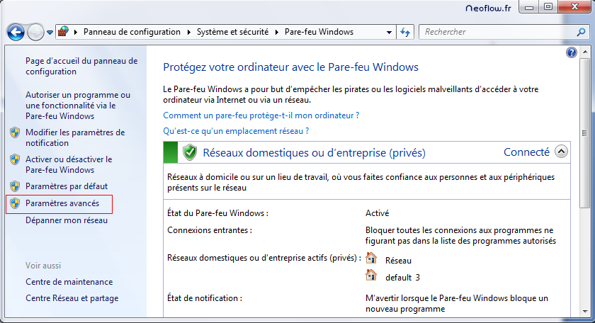 Accédez aux paramètres avancés du Pare-feu en allant dans :