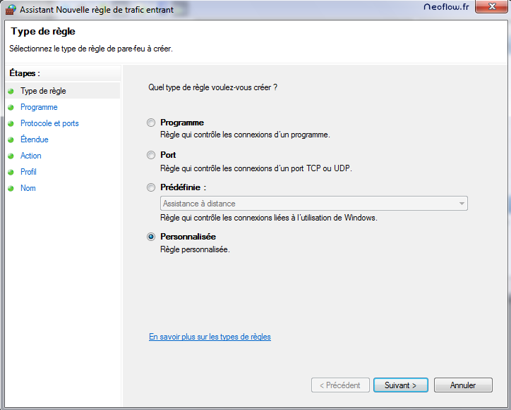 En ce qui concerne le type de règle, choisissez « Personnalisé » pour pouvoir paramétrer de manière plus flexible la règle. Puis faites « Suivant ».