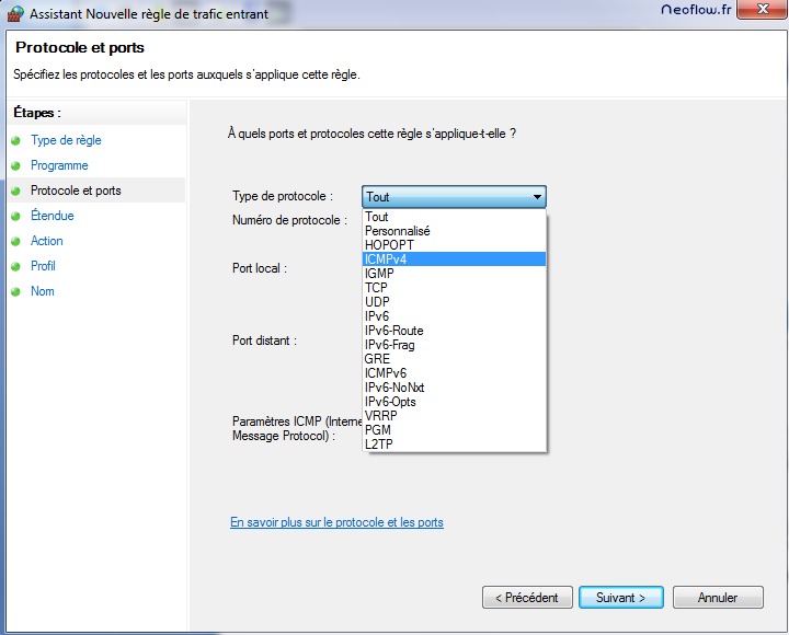 Ensuite, il faut indiquer le protocole le ping correspondant au protocole ICMP et cela dans le cas d’adresses IPv4 nous choisissons ICMPv4. Si votre réseau fonctionne avec adresses IPv6 choisissez ICMPv6.