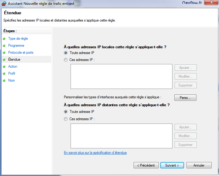 Il faut indiquer qu’elles adresses IP sont autorisées, étant donné que cette règle est globale et doit être valable pour n’importe quel hôte du réseau il faut autoriser « tous le monde », laissez les paramètres par défaut de cette étape.