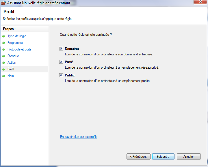 Vous devez choisir pour quel type de profil réseau la règle s'applique :