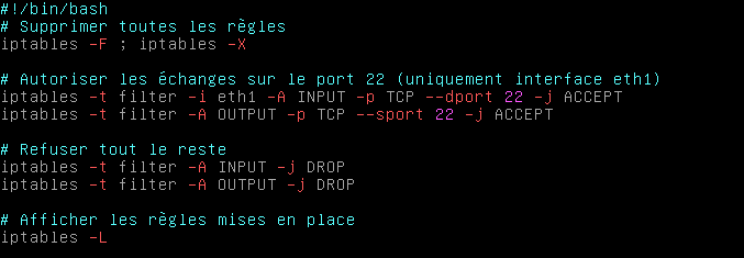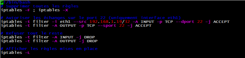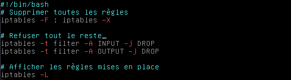 # !/bin/bash # Supprimer les règles écrites iptables -F ; iptables -X #... nouvelles règles # Lister les règles nouvellement écrites iptables -L