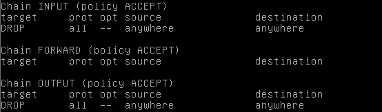iptables -t filter A INPUT -j DROP iptables -t filter A OUTPUT -j DROP