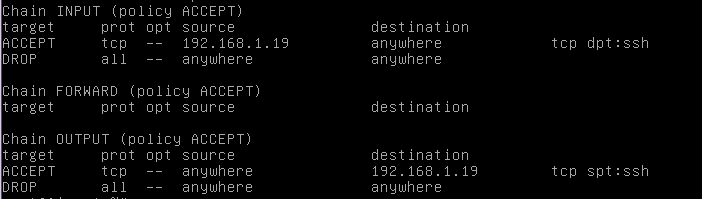 On voit donc dans les colonnes "source" de "Chain INPUT" et "destination" de "Chain OUTPUT" que le port SSH (22) n'est ouvert que pour une IP précise.