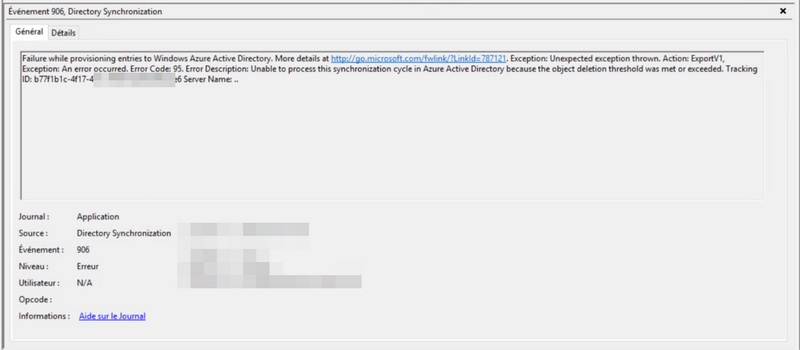 Sur le serveur où est installé l'outil de synchronisation, le message d'erreur "ID 906 Directory Synchronization" sera généré dans le cas où cela se produit : "Failure while provisioning entries to Windows Azure Active Directory. More details at.... Unable to process this synchronization cycle in Azure Active Directory because the object deletion threshold was met or exceeded."
