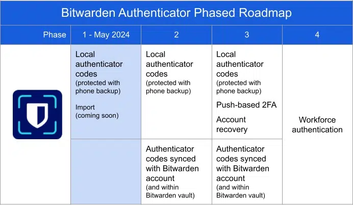 Comme le montre l'image ci-dessous, correspondante à la feuille de route de Bitwarden Authenticator, d'autres fonctionnalités seront ajoutées par la suite. Il y aura notamment la possibilité de synchroniser ses comptes Bitwarden Authenticator sur les serveurs de Bitwarden, et les retrouver dans son coffre-fort de mots de passe. Il est également prévu l'ajout d'un mode de restauration et la prise en charge du 2FA par notifications ("Push-based 2FA").