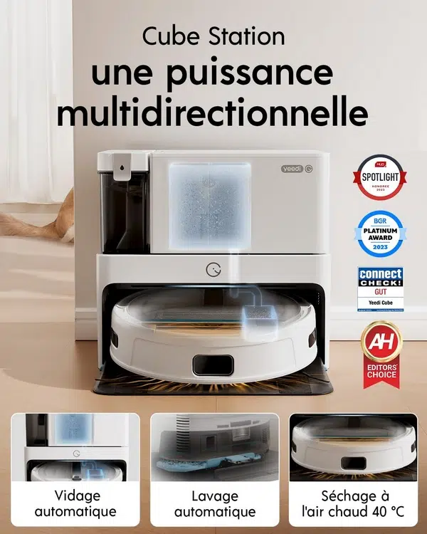 Le yeedi Cube, c'est le dernier robot haut de gamme de la marque ! Il s'agit d'un appareil autonome, capable de laver et aspirer en un seul passage. Sa station lui sert à recharger sa batterie, mais aussi à vider son réservoir à poussières et à laver automatiquement sa serpillière avec de l'eau. À la fin du nettoyage, la serpillière est séchée à l'air chaud (40°c) pour éviter les mauvaises odeurs liées à l'humidité. En plus de sa serpillière capable de vibrer 2 500 fois par minute, le robot aspire très fort : jusqu'à 5 100 Pa.