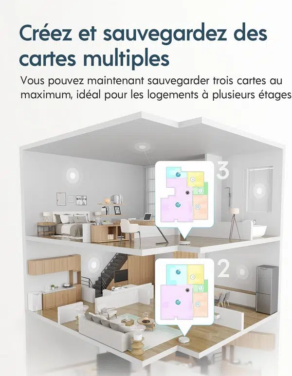 Ce modèle est identique à celui présenté ci-dessus, sauf que cette version intègre directement une station plus évoluée permettant au robot de vider automatiquement son réservoir à poussières.