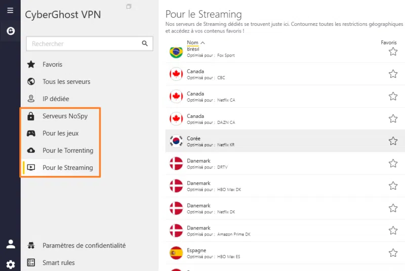 L'utilisation de CyberGhost VPN peut se résumer à choisir le bon serveur VPN en fonction de ses besoins et des situations : vous n'êtes pas obligé d'utiliser les options avancées que nous allons voir par la suite.