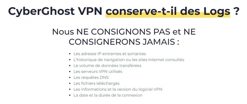 Pour rassurer ses clients, CyberGhost VPN n'hésite pas à mettre en avant sa politique de non-conservation des données : ce qui est un point essentiel lorsque l'on cherche à protéger ses données personnelles et sa vie privée sur Internet. Par ailleurs, en 2022, la solution CyberGhost VPN a été inspectée et approuvée par le cabinet indépendant Deloitte.