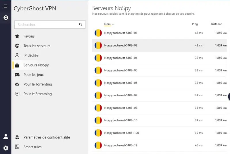 CyberGhost VPN met également en avant une catégorie de serveurs baptisée "NoSpy" et qui fait référence uniquement à des serveurs situés en Roumanie. Pourquoi ? Il s'agit d'un serveur bénéficiant de la politique Zero Log puisque la Roumanie ne fait partie d'aucune alliance pour le partage de renseignements. En effet, les alliances des 5 yeux, 9 yeux et 14 yeux sont des accords de partage de renseignements entre différentes nations, dont la France fait partie, au même titre que d'autres pays d'Europe, ainsi que les États-Unis, l'Australie, etc.