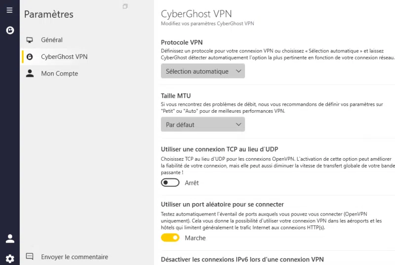 Dans les paramètres de CyberGhost VPN, nous pouvons personnaliser notre client VPN à l'aide de différentes options. Par défaut, CyberGhost choisira le protocole VPN le plus adapté à votre connexion, mais vous pouvez forcer l'utilisation d'un protocole spécifique entre OpenVPN, IKEv2, et WireGuard. D'ailleurs, nous savons que WireGuard est beaucoup plus performant qu'OpenVPN.