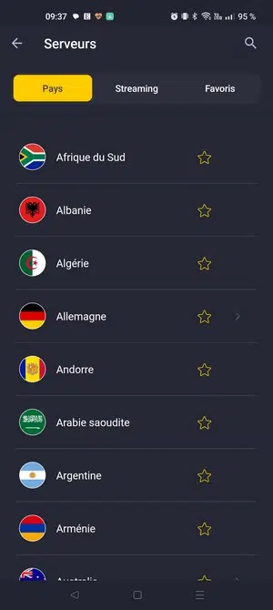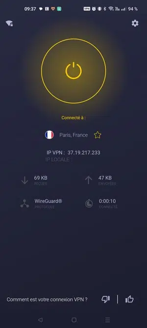 Lorsqu'une connexion est active, vous avez des informations utiles telles que l'emplacement du serveur VPN, son adresse IP, ainsi que la quantité de données émises et reçues, le temps de connexion en VPN, ainsi que le protocole VPN utilisé. Vous pouvez vous constituer une liste de serveurs VPN favoris.