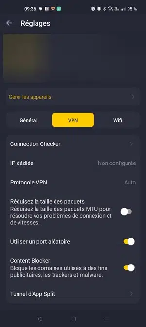 Lorsque le VPN est actif, vous pouvez bénéficier d'une protection pour bloquer certains logiciels malveillants et éliminer la publicité (attention, sur YouTube, cela n'élimine pas les publicités).