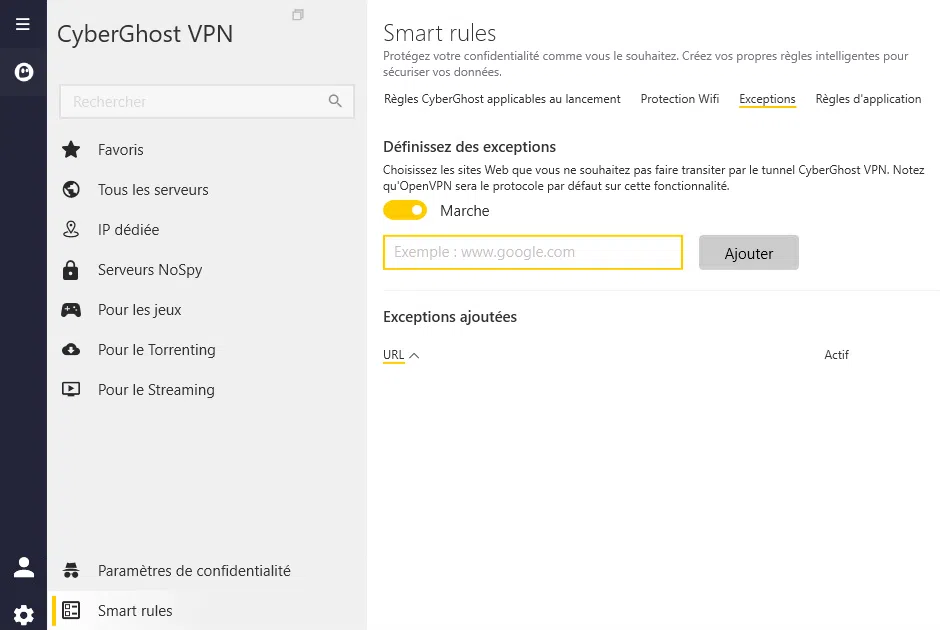 Une autre section baptisée "Smart rules" regroupe des fonctionnalités pour ajuster le comportement du VPN CyberGhost.