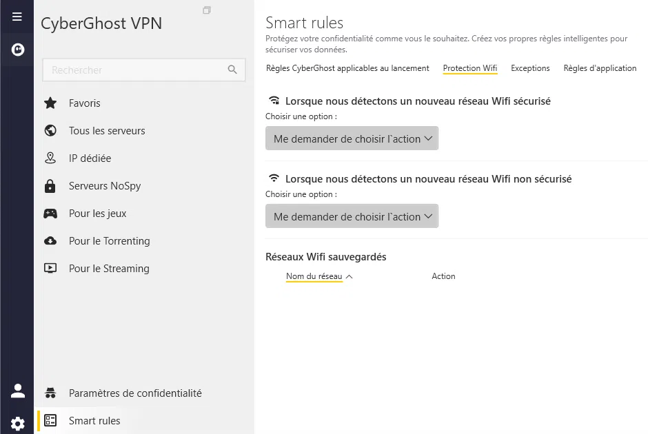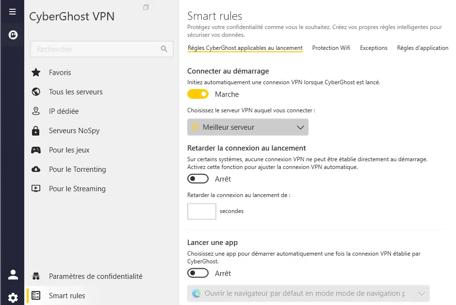 - CyberGhost peut activer le VPN dès qu'il détecte une connexion sur un réseau Wi-Fi non sécurisé (très pratique !)