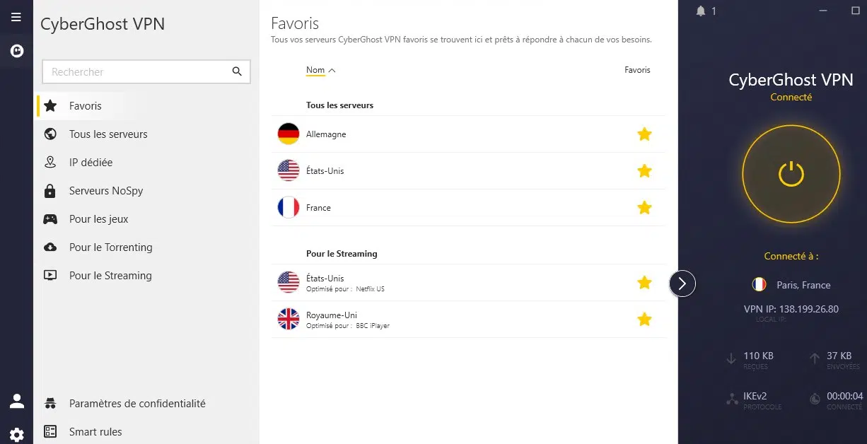 L'utilisation de CyberGhost VPN peut se résumer à choisir le bon serveur VPN en fonction de ses besoins et des situations : vous n'êtes pas obligé d'utiliser les options avancées que nous allons voir par la suite.