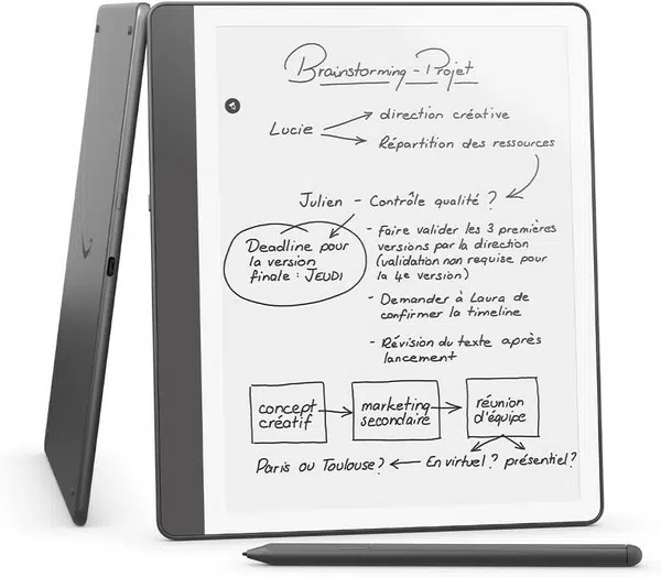 L'Amazon Kindle Scribe combine liseuse grand format et bloc-notes numérique, avec un stylet permettant d’annoter livres et documents. Vous pouvez aussi créer vos propres notes, directement sur son écran de 10,2 pouces. Son écran Paperwhite offre un confort de lecture proche du papier, même pour de longues sessions.