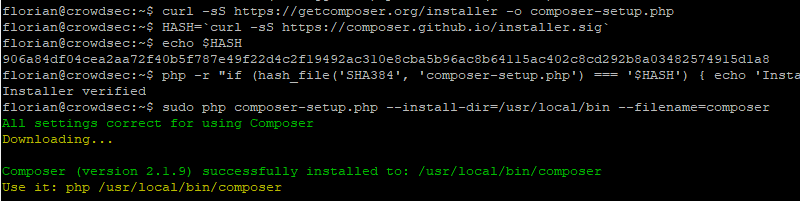 Puis, on lance la commande fournie sur le site officiel de Composer qui va permettre de vérifier le hash avant que l'installation soit lancée :