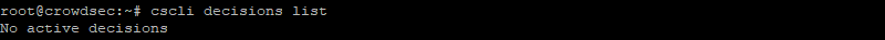 On peut regarder si nous avons des décisions actives au niveau de notre instance CrowdSec. En toute logique, non. Vérifions que ce soit bien le cas avec la commande ci-dessous issue de "cscli", l'ensemble de commandes associées à CrowdSec.