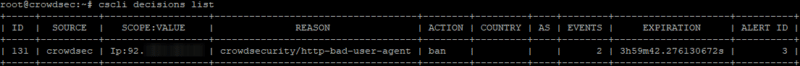 root@Canna-pi:/home/pi/Downloads# sudo cscli decisions list