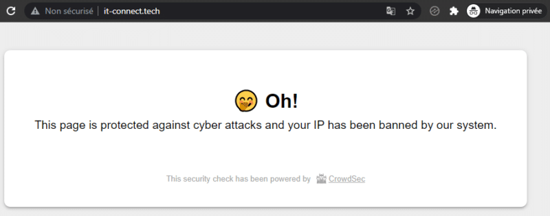 Si j'essaie d'accéder au site avec un navigateur, on peut voir qu'un message s'affiche pour indiquer que mon adresse IP a été bloquée par CrowdSec ! Le Bouncer PHP est entré en action !