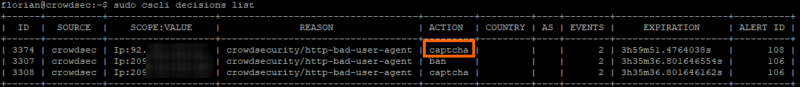 Si on liste les décisions actives, on peut voir que mon adresse IP est bien associée à l'action "captcha" au lieu de l'action "ban". On peut voir aussi que mon instance CrowdSec a banni quelqu'un d'autre, qui visiblement, s'en prend à mon serveur Web.