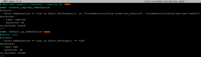 La partie "filters" sert à spécifier que l'on cible seulement les scénarios d'alertes "http-crawl-non_statics" et "http-bad-user-agent". Ensuite, au niveau du "type", on spécifie "captcha" au lieu de "ban" qui est l'action standard.