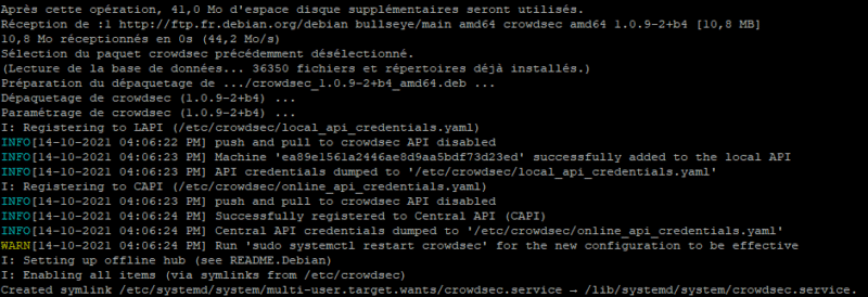 Sauvegardez le fichier et fermez-le. Il ne reste plus qu'à relancer CrowdSec :