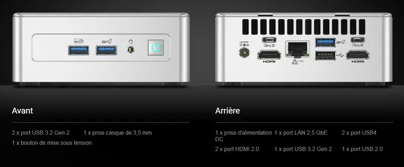 Côté réseau filaire et sans-fil, le boitier intègre un port Ethernet RJ45 en 2.5 Gbit/s et une puce Wi-Fi 6E, ainsi que le Bluetooth 5.2. Il intègre aussi 6 ports USB, dont 2 ports USB4, ainsi que 2 ports HDMI 2.0. Au total, vous pouvez connecter 4 écrans en même temps sur ce mini PC. Voici un aperçu global de la connectique :