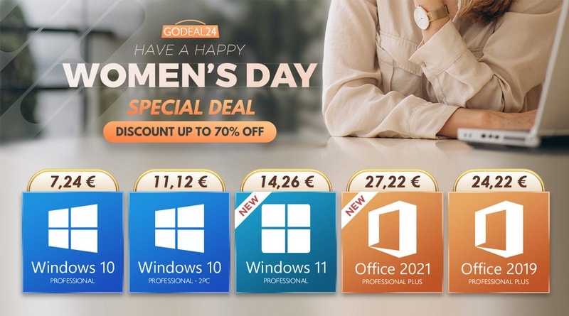 Sur le site GoDeal24, une nouvelle fournée de promotions est disponible sur les licences Windows 11, Windows 10, mais aussi la suite Office, afin de célébrer la journée de la femme prévue pour le 8 mars 2022.