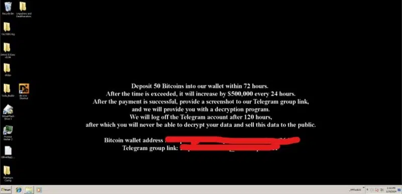 Une note de rançon accompagne les données chiffrées et le fond d'écran de la machine est modifié, comme le montre l'exemple ci-dessous. Dans le cas présent, la rançon s'élève à 50 bitcoins, ce qui représente plus de 1,8 million d'euros. La victime dispose de 5 jours pour payer la rançon et déposer une preuve de paiement sur un groupe Telegram, dans le but de recevoir une clé de déchiffrement.