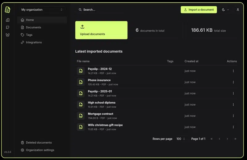 Papra est une plateforme d'archivage de documents minimaliste pour organiser vos archives personnelles ou professionnelles. Beaucoup plus légère que Paperless-Ngx, la solution Papra facilite le tri, le taggage et la recherche de documents numérisés ou importés. L'outil propose des fonctionnalités pratiques comme l'importation automatique depuis une boîte mail. Papra est développé par un Français, qui est aussi à l'origine de IT-Tools.