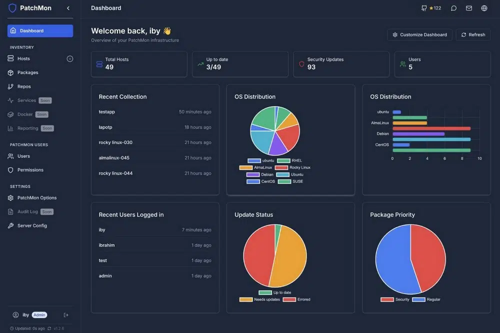 PatchMon est une solution dédiée à la surveillance de l'état des mises à jour de vos serveurs Linux. Il permet de visualiser en un coup d'œil quels serveurs nécessitent des correctifs, en mettant notamment en évidence les correctifs de sécurité. L'outil utilise des agents légers qui remontent l'inventaire des paquets vers un tableau de bord central (donc pas de port à ouvrir sur vos serveurs, puisqu'on pousse l'information vers le serveur PatchMon).
