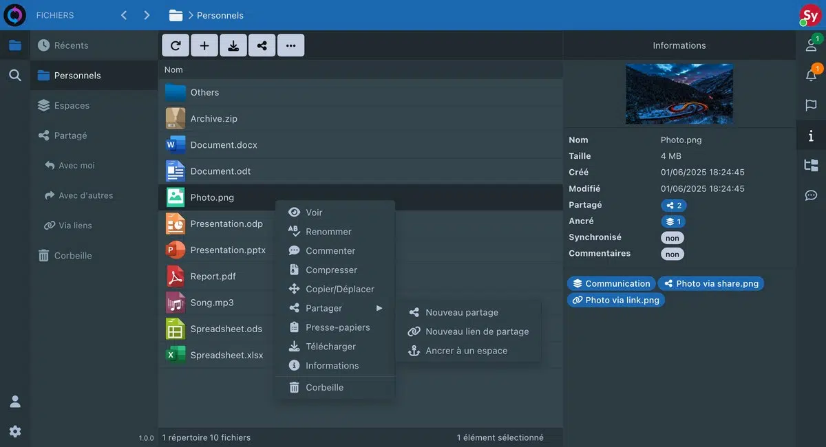 Sync-in est une solution de cloud privé qui met l'accent sur la collaboration et le partage sécurisé de fichiers. Chaque utilisateur dispose de son espace personnel (comme un Drive) pour stocker ses fichiers et y accéder depuis n'importe où. En tant qu'alternative à nextCloud, Sync-in permet aussi de créer des espaces de travail dédiés où plusieurs utilisateurs peuvent éditer et synchroniser des documents en ligne (via l'intégration d'OnlyOffice).