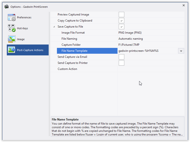 Je vous emmène ensuite dans les "Post Capture Actions", on va ici déterminer les actions qui vont être menées juste après une capture d'écran. C'est ici que l'on voit l'intérêt de Gadwin PrintScreen selon moi. En effet, on va pouvoir enregistrer nos screens automatiquement sans avoir à ressaisir un nom à chaque fois et en les dirigeant vers un dossier spécifique automatiquement, ce qui ne peut pas être fait avec l’outil de Capture Windows.