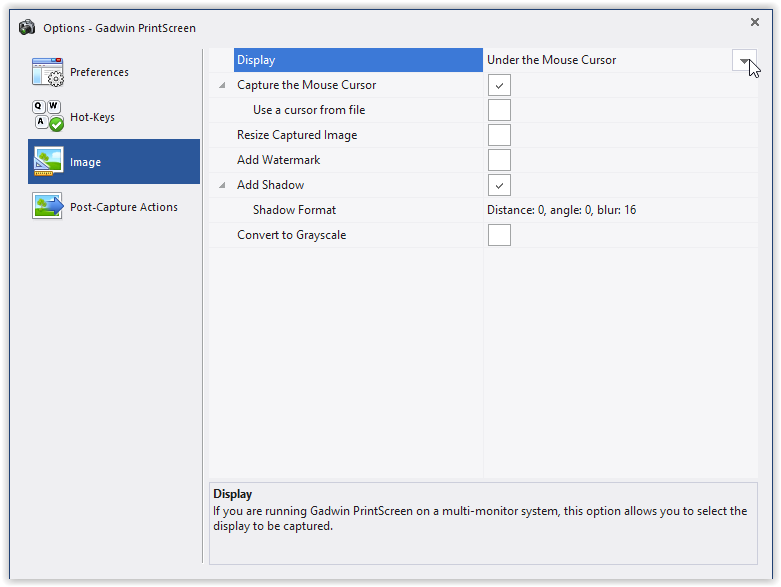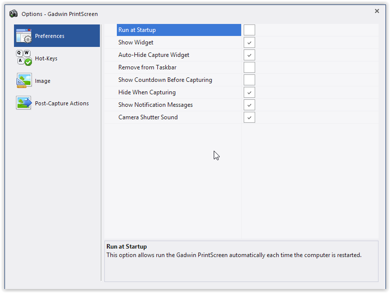 Enfin, nous allons pouvoir gérer les raccourcis qui permettront de faciliter la capture d'écran. Par défaut, Gadwin PrintScreen s'utilisera avec la touche standard d'impression-écran. On pourra voir des possibilités supplémentaires avec "Maj + Prt scr" pour prendre une capture de la fenêtre active ou "Ctrl + Ptr scr" pour prendre une capture a taille personnalisée :
