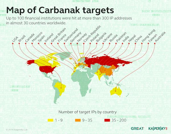 Par ailleurs, voici une carte publiée par Kaspersky et qui montre les payés ciblés par Carbanak :