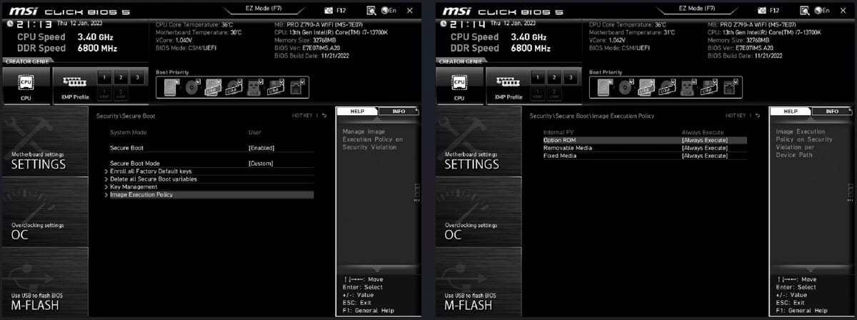 Un problème mis en lumière aujourd'hui mais qui n'est pas récent ! Suite à une mise à jour du firmware publiée par MSI le 18 janvier 2022 et correspondante à la version 7C02v3C, il s'avère qu'il y a eu un changement au niveau des paramètres par défaut du Secure Boot sur les cartes mères MSI. Résultat, même s'il y a un code malveillant qui se charge au démarrage de la machine, celle-ci démarrera car le Secure Boot autorise le démarrage même lorsqu'il y a une violation de la sécurité !