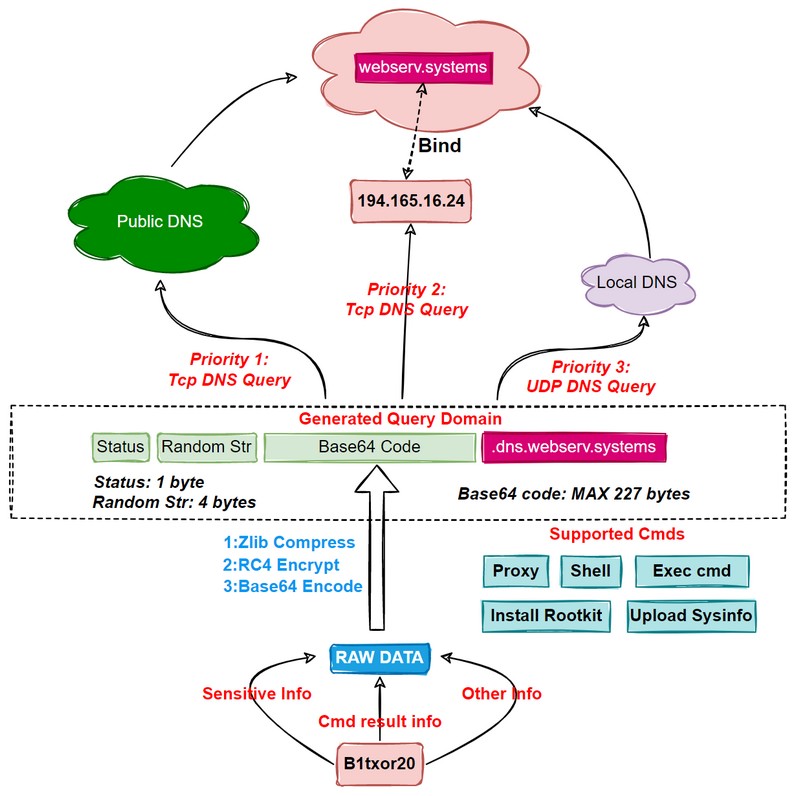 Le malware B1txor20 utilise de la tunnellisation DNS (DNS Tunneling) pour créer un canal de communication avec le serveur C2 (command & control). Même s'il s'agit d'une technique ancienne, elle reste fiable et efficace afin de permettre aux pirates d'exploiter le protocole DNS pour transférer les données au sein de requêtes DNS.