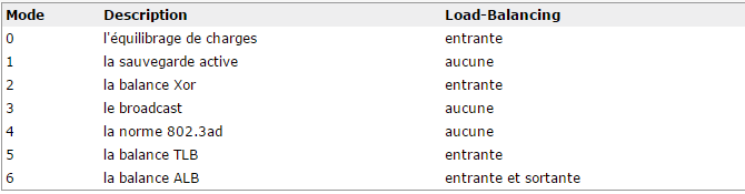 Comme on l’a souligné précédemment, il existe plusieurs modes distincts permettant alternativement de faire du secours et/ou de l’équilibrage de charge. Ces modes correspondent aux sept options possibles pour le module bonding :