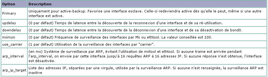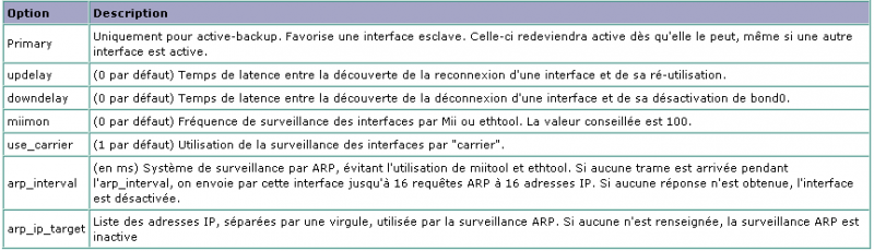 L’activation du bonding dispose de quelques options axées sur l’archivage, les latences et la surveillance ARP. Ci-dessous un tableau récapitulatif de ces différentes options :