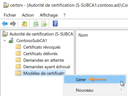 Tout d'abord, il nous faut créer un modèle personnalisé. Depuis la console de gestion de l'autorité, connectée sur ContosoSubCA1, réalisez un clic-droit "Gérer", à la rubrique "Modèles de certificats".