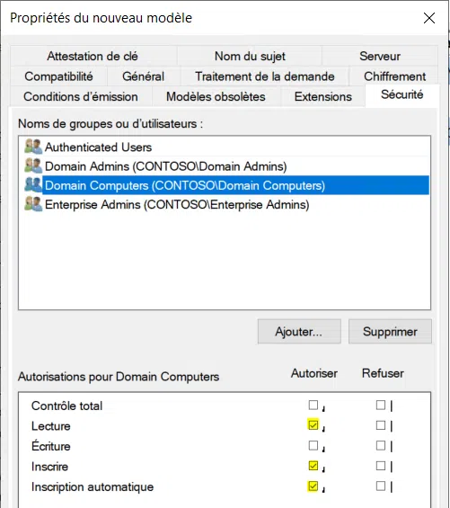 Je ne m'étends pas sur toutes les options liées au modèle et vous invite à vous référer au chapitre qui les explicite. En revanche, je m'attarde un peu plus sur l'onglet "Sécurité". Ici, il nous faut attribuer des permissions nécessaires à l'inscription automatique. Elles peuvent être positionnées sur le groupe "Ordinateurs du domaine", pour autoriser toutes les machines du domaine, ou sur un groupe plus restreint qui aura été créé au préalable dans l'Active Directory.