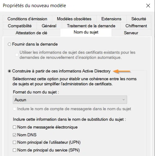 Notez bien que le modèle doit spécifier que les informations pour construire le certificat sont récupérées automatiquement depuis l'AD, autrement l'inscription automatique ne peut pas fonctionner.
