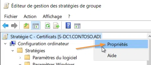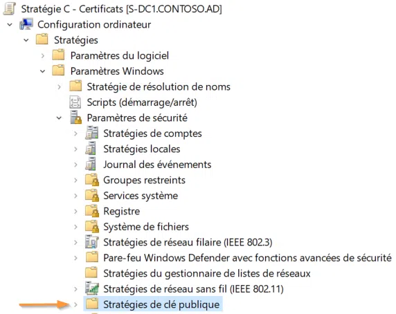 - Configuration Ordinateur > Stratégies > Paramètres Windows > Paramètres de sécurité > Stratégie de clé publique.