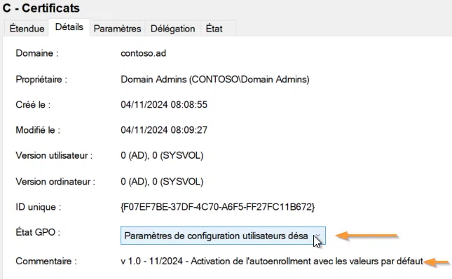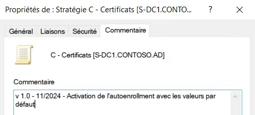 Une stratégie de groupe permettra d'activer l'inscription automatique (autoenrollment) sur le poste utilisateur. Vous pouvez utiliser une stratégie existante ou une nouvelle. Ici, j'ai fait le choix d'en créer une nouvelle. Je commence par appliquer les bonnes pratiques : commentaires, liaison.