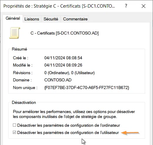 Il faut également modifier le périmètre d'application de la GPO, depuis l'onglet "Général", puisqu'il s'agit uniquement de paramètres liés au compte ordinateur. On coche alors la case "Désactiver les paramètres de configuration de l'utilisateur".